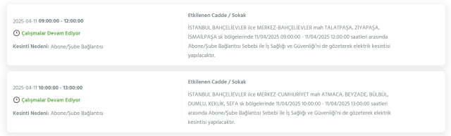 Etkilenen Cadde / Sokak İSTANBUL BAHÇELİEVLER ilce MERKEZ-CUMHURİYET mah ATMACA, BEYZADE, BÜLBÜL, DUMLU, KEKLİK, SEFA sk bölgelerinde 11/04/2025 10:00:00 – 11/04/2025 13:00:00 saatleri ortasında Abone/Şube Kontağı Sebebi ile İş Sıhhati ve Güvenliği’ni de gözeterek elektrik kesintisi yapılacaktır.